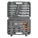 Набор: 59 шт • Ключи: комбинированные, шестигранные • Головки: 6-ти гранные головки, свечные • Ключей-трещоток: 2 шт • Хранение: пластиковый кейс