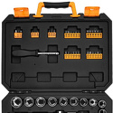 КомплектацияТорцевые шестигранные головки 1/2″ (10, 11, 12, 13, 14, 15, 16, 17, 18, 19, 20, 21, 22, 23, 24, 27 мм), 1/4″ (4, 5, 6, 7, 8, 9, 10, 11, 12, 13 мм)