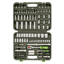 Головки торцевые подробно1/4": 4, 4.5, 5, 5.5, 6, 7, 8, 9, 10, 11, 12, 13, 14 мм; длинные 1/4": 6, 7, 8, 9, 10, 11, 12, 13 мм; Torx 1/4": E4, E5, E6, E7, E8; с битами 1/4": SL4, SL5.5, SL6, PH1, PH2, PZ1, PZ2, H3, H4, H5, H6, T8, T10, T15, T20, T25, T27, T30; вороток т-образный 1/4": 115 мм; трещетка 1/4": 45 зубов; удлинитель 1/4": 50, 100 мм; карданный шарнир 1/4"; 1/2": 10, 11, 12, 13, 14, 15, 16, 17, 18, 19, 20, 21, 22, 24, 27, 30, 32 мм; длинные 1/2": 14, 15, 17, 19, 22 мм; Torx 3/8": E10, E11, E12, E14, E16, E18, E20, E24; свечные 1/2": 16, 21 мм; трещетка 1/2": 45 зубов; удлинитель 1/2": 125, 250 мм; карданный шарнир 1/2";