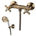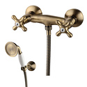 Назначение: душ • Конструкция: двухрычажный • Монтаж: вертикальный • Материал: покрытие - бронза • Подводка: жесткая • Монтажные отверстия: 2 отверстия • Душевая лейка в комплекте: есть • Держатель для душевой лейки: настенный держатель • Эксцентрики в комплекте: есть • Донный клапан в комплекте: есть