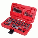 КомплектацияМетчики и плашки - 34 шт: M3×0.5, M3×0.6, M4×0.7, M4×0.75, M5×0.8, M5×0.9, M6×1.0, M7×1.0, M8×1.25, M9×1.0, M9×1.25, M10×1.25, M10×1.5, M11×1.5, M12×1.5, M12×1.75, 1/8BSP28; Ключ трещоточный – 1 шт; Метчикодержатель M3-M6 – 1 шт; Метчикодержатель M6-M12 – 1 шт; Плашкодержатель – 1 шт; Резьбомер – 1 шт; Отвертка - 1 шт