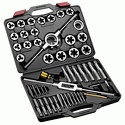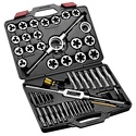 КомплектацияМетчики - 20 шт; Плашки Ø посадки 38 мм - 14 шт; Плашки Ø посадки 51 мм - 6 шт; Экстракторы - 5 шт; Кернер автоматический - 1 шт; Метчикодержатель с Т-образной рукояткой для малых размеров - 1 шт; Метчикодержатель для больших размеров - 1 шт; Плашкодержатель 51 мм с адаптером 1-1/2" - 1 шт; Адаптер для плашкодержателя 38 мм - 1 шт; Отвертка - 1 шт.