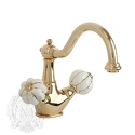 Назначение: для биде • Конструкция: двухрычажный • Монтаж: горизонтальный • Клапан: керамический • Материал: латунь, покрытие - золото • Подводка: гибкая • Монтажные отверстия: 1 отверстие • Форма излива: традиционная • Душевая лейка в комплекте: нет • Аэратор: есть • Донный клапан в комплекте: есть