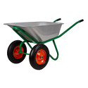 Тип: Тачка; Назначение: садово-строительная; Полезный объем: 100; Максимальная нагрузка: 320; Материал изготовления: оцинкованная сталь; Опора: есть; Количество колес: 2; Диаметр колес: 380; Фиксация груза: нет; Складная конструкция: нет; Прочие особенности и свойства: Тачка садово-строительная предназначена для перевозки различных грузов, строительных материалов, при проведении сельскохозяйственных или строительных работ., Для защиты от коррозии, рама, опора, колесные диски, окрашены порошковой эмалью