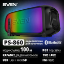Производитель: Sven Модель: PS-860 - номинальная мощность 100 Вт - воспроизведение с USB/microSD - питание от аккумулятора Описание
