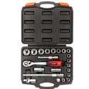 КомплектацияГоловки торцовые 1/2″ - (10,11,12,13,14,15,16,17,18,19,22,24,27,30,32 мм) - 15 шт.Головки торцовые свечные с резиновой вставкой 1/2″ - (16,21 мм) - 2 шт.Трещотка с быстрым сбросом 1/2″ 72 зубца- 1 шт.Шарнир карданный 1/2″ - 1 шт.Удлинители для торцовых головок 1/2″ - (125,250 мм) - 2 шт.Адаптер трехпозиционный 3/8″M х 1/2″F -1 шт.Пластиковый кейс - 1 шт.