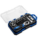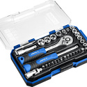 Комплектация- Головки торцовые 1/4": 4, 4.5, 5, 5.5, 6, 7, 8, 9, 10, 11, 12, 13- Трещотка с быстрым сбросом, 72 зубца- Вороток-отвертка- Шарнир карданный- Удлинитель 50 мм- Ключи имбусовые: 1.27, 1.5, 2, 2.5 мм- Переходник для бит SQ 1/4" x HEX 1/4"- Биты: SL5, PH1, PH2, PH3; HEX H3, H4, H5, H6; TORX T10, T15, T20, T25, T30, T40