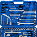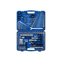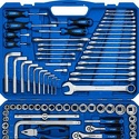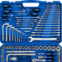КомплектацияГоловки торцовые двенадцатигранные 1/2″ - (8,10,12,13,14,15,16,17,18,19,20,21,22,23,24,25,27,30,32 мм) - 19 шт.Головки торцовые двенадцатигранные 3/8″ - (6,7,8,9,10,11,12,13,14,15,17,18,19,21,22 мм) - 15 шт.Головки торцовые FLANK 1/4″ - (4,4.5,5,5.5,6,7,8,9,10 мм) - 9 шт.Головки торцовые E-TORX 1/2″ - (E10,E12,E14,E16,E20) - 5 шт.Головки торцовые E-TORX 1/4″ - (E4,E5,E6,E7,E8) - 5 шт.Головки торцовые свечные с резиновой вставкой 1/2″ - (16,21 мм) - 2 шт.Трещотки для торцовых головок с быстрым сбросом 72 зубца - (1/2″,3/8″,1/4″) - 3 шт.Шарниры карданные - (1/2″,3/8″,1/4″) - 3 шт.Удлинители для торцовых головок 1/2″ - (75,250 мм) - 2 шт.Удлинители для торцовых головок 3/8″ - (75,150 мм) - 2 шт.Удлинители для торцовых головок 1/4″ - (50,100,150 мм) - 3 шт.Удлинитель гибкий 1/4″ - (150 мм) - 1 шт.Адаптеры трехпозиционные - (3/8″F x 1/2″M, 3/8″F x 1/4″M) - 2 шт.Вороток-отвертка 1/4″ - (150 мм) - 1 шт.Вороток L-образный 1/2″ - (250 мм) - 1 шт.Вороток перекидной 1/2″ - 1 шт.Переходник для бит - (HEX1/4″F х SQ1/4″F) - 1 шт.Биты 1/4″ х 25 мм - (T10,T15,T20,T25,T27,T30,T40,SL4,SL5.5,SL7,H2,H3,H4,H5,H6,H7,H8,H10,PZ0,PZ1,PZ2,PZ3,PH0,PH1,PH2,PH3) -26 шт.Плоскогубцы 180 мм - 1 шт.Клещи переставные - 1 шт.Отвертки - (SL5.5 x 75,SL6.5 x 38,SL6.5 x 100,PH1 x 75,PH2 x 38,PH2 x 100 мм) - 6 шт.Молоток кованый с фибергласовой рукояткой 300 г - 1 шт.Ключи комбинированные - (6,7,8,9,10,11,12,13,14,15,16,17,18,19,21,22,24 мм) - 17 шт.Ключи рожковые - (8 х 10,10 х 12,11 х 13,12 х 14,17 х 19 мм) - 5 шт.Ключи имбусовые - (H2.5,H3,H4,H5,H6,H7,H8,H10,H12,H14) - 10 шт.